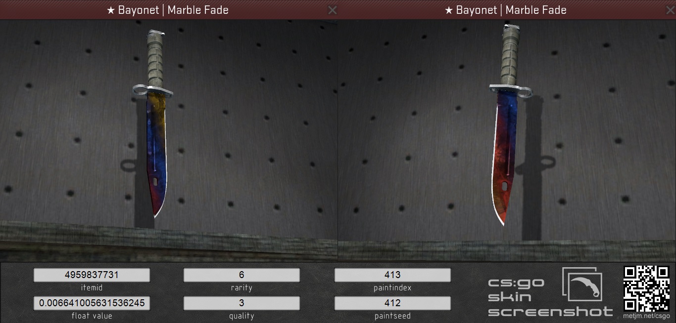The marble fade pattern for karambit bayonet flip and gut knives has many different possible patterns depending on the pattern index of the knife the pattern index is what determines where the pattern begins or sits on the blade not to be confused with the paint index 413 which determines what skin the knife is.